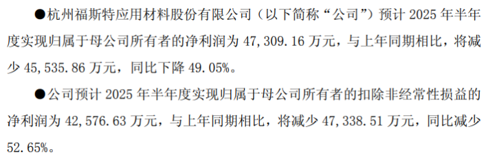 业绩预告显示,福斯特预计2025年上半年实现归母净利润4.73亿元,较上年同期将减少4.55亿元,同比下降49.05%;同期扣非后净利润4.26亿元,较上年同期将减少4.73亿元,同比减少52.65%。